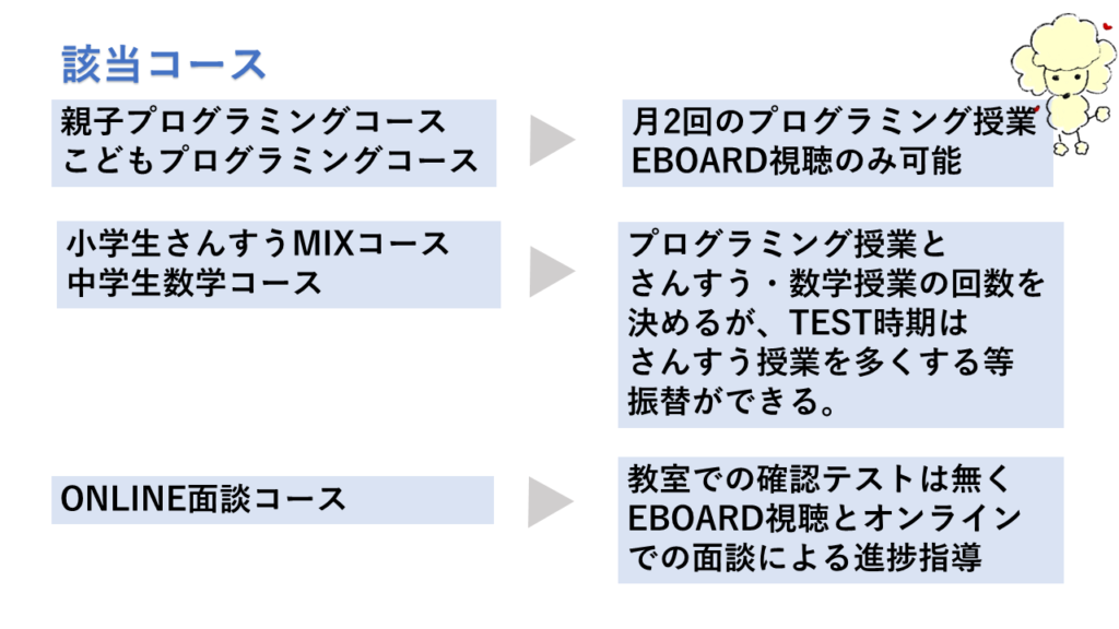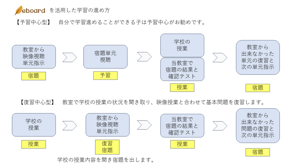 *予習中心か復習中心かは、面談で決めますが、状況により変更または併用型もあります。*教室ではさんすう・数学中心ですが映像授業は、EBOARDのすべての授業を視聴できます。