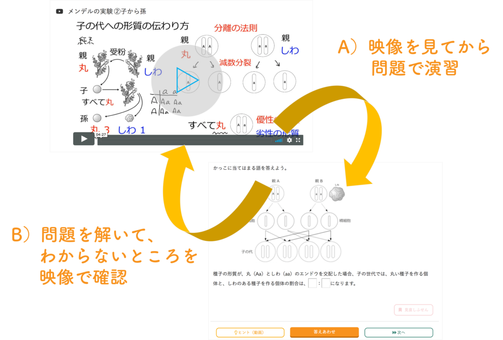 学習の進め方A)授業を見てから問題を演習B) 問題を解いて、わからない所を映像で確認